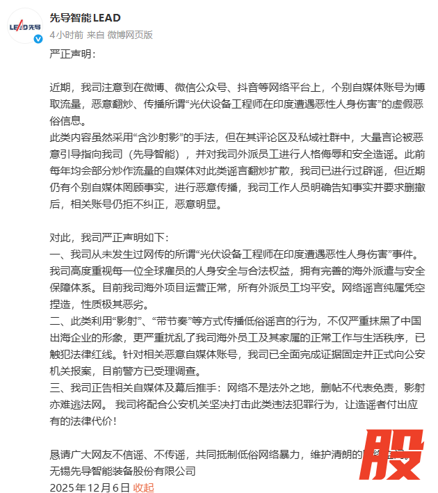 先导智能:公司从未发生过网传“光伏设备工程师在印度遭遇恶性人身伤害”事件先导智能:公司从未发生过网传“光伏设备工程师在印度遭遇恶性人身伤害”事件